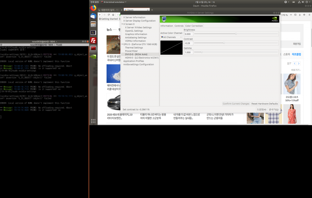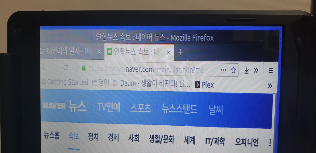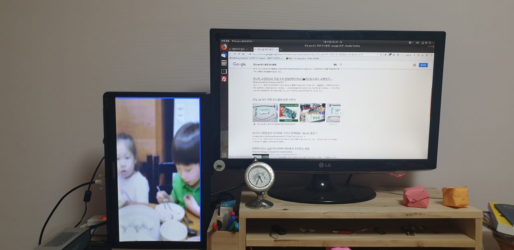 삽질을 하다보니 주파수 75hz, 해상도 낮음 설정이 모니터를 동작시켰다. 다만 노이즈가 보이고 해상도가 낮아 눈아플 지경이다. 처음 꿈은 2축 모니터 암도 구매하여 피벗구성이었다. 그러나 지금 상태로 여기에 지출하는 한푼도 아깝다. 결국 테이프로 옆 모니터와 책상에 고정했다.