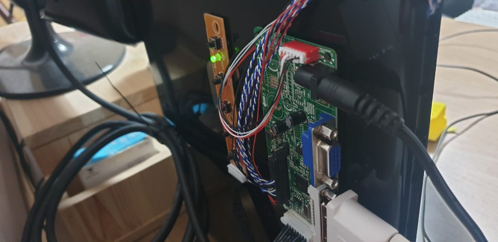 파워 모듈이 받은 보드세트에 없었다. 구매 옵션에 없었지만 별도로 구매를 했어야했다. pcb에 12V로 기록되어 있어 이를 믿고 전에샀던 외장하드 드라이브 파워를 쓰기로했다. 기존 노트북에 붙어있던 40핀 lsvd? 케이블을 떼어냈다. 패널에 테이프로 붙어있었는데, 떼어보니 핀 커버까지 뜯겨나갔다. 새로온 보드 케이블을 연결하고 다시 조립했다.
