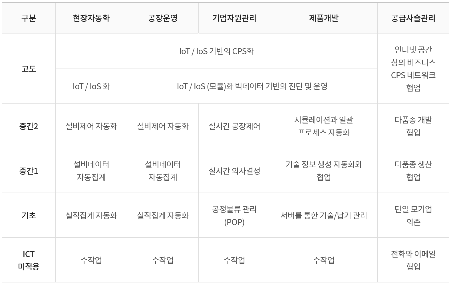 - 고도화 수준: 지능형 유연 생산이 가능해지며, 이는 CPS와 AI 기술을 활용하여 가능해집니다3.