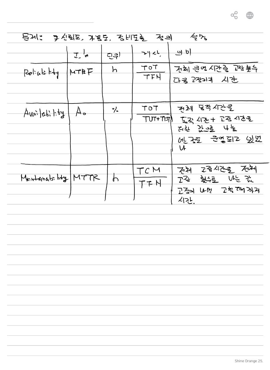 - 가용도(Availability): 가용도는 체계가 어떤 시점에서 만족스럽게 작동할 수 있는 확률로서, 신뢰도와 보전도의 합으로 정의됩니다. 즉, 가용도 = 신뢰도 + 보전도 = (MTBF) / (MTBF + MTTR) = (평균 고장시간 간격) / (평균 고장시간 간격 + 평균 수리시간)입니다2.