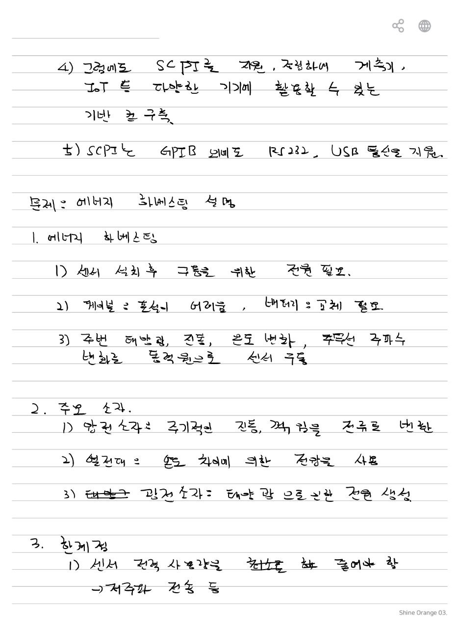 - RF 에너지: 무선 통신에서 발생하는 RF(Radio Frequency) 에너지를 수집하여 사용합니다. 주변의 무선 통신 신호를 수집하고 에너지로 변환하여 장치를 작동시킵니다.