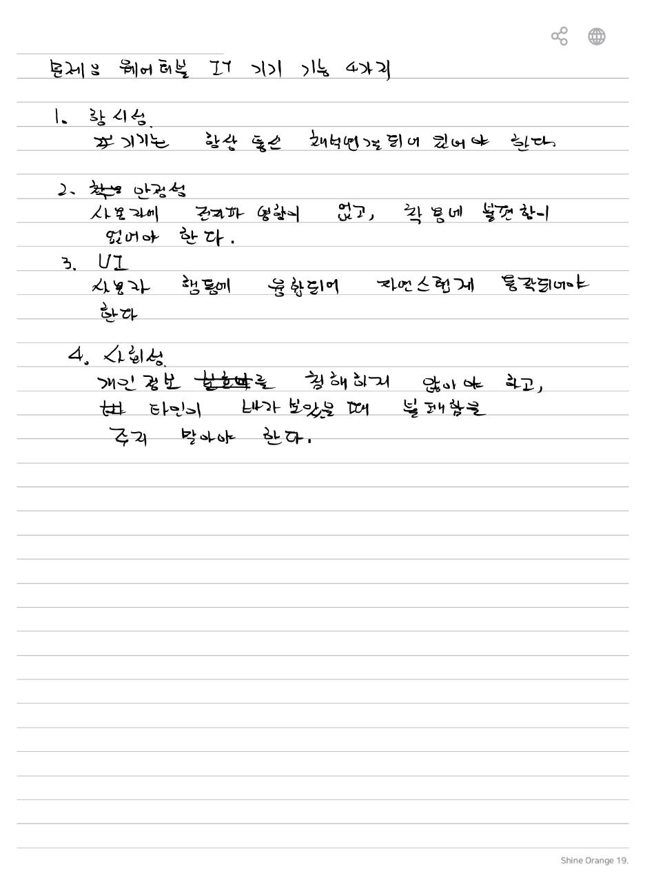웨어러블 IT글쓴이 이대원 / 2024-03-07 웨어러블(Wearable) IT기기의 기본기능 4가지를 설명하시오. 스마트웨어러블-기술-및-표준화-동향다운로드 23-5_079_088-웨어러블-컴퓨터-기술-및-개발동향다운로드