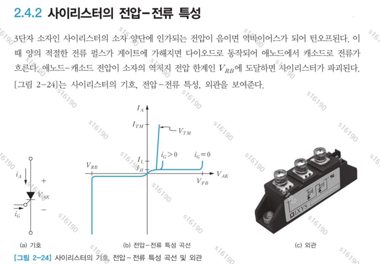 - 사이리스터: 불완전한 스위치. ON은 가능하지만 OFF는 역전압 필요.