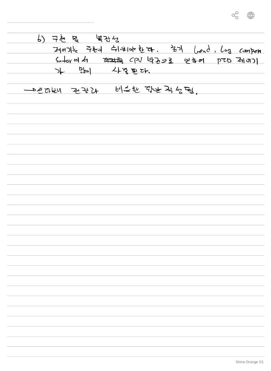 - 조절기는 시스템의 변화에 신속하게 반응하여 적절한 조치를 취할 수 있어야 합니다. 빠른 응답성은 시스템이 외부 변화나 교란에 빠르게 적응하여 안정적인 상태를 유지할 수 있게 합니다.