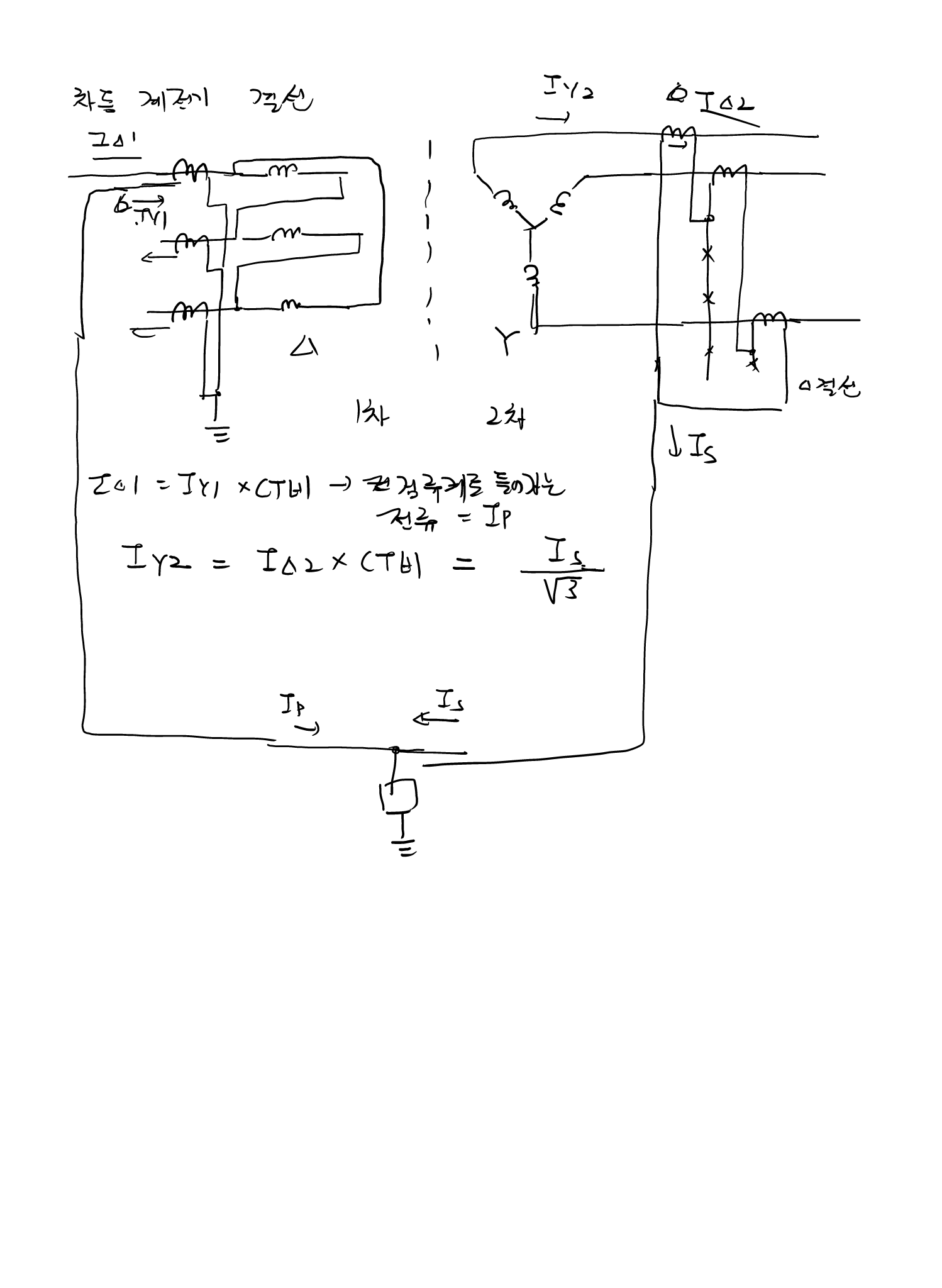 차동 계전기로 들어가는 전류값은 DELTA결선일 때 전류 * 루트3배 만큼 들어감.