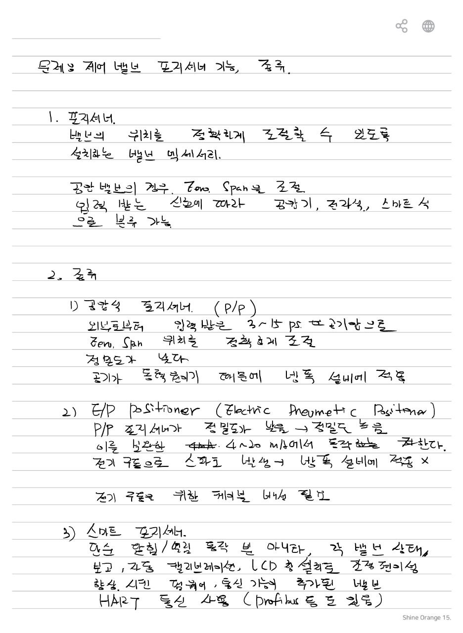 - P/P 포지셔너 (Pneumatic Positioner): 외부로부터 입력 받은 신호를 공압 (0.2~1kgf/cm^2 or 3~15 psi)으로 하는 포지셔너입니다1. 전기신호로 제어하려면 전기신호를 공압신호로 바꾸어주는 I/P 컨버터를 설치해야 합니다1. 일반적으로 E/P 포지셔너 또는 Smart 포지셔너에 비해 정밀도가 나쁘지만, 오래된 플랜트나 폭발위험이 매우 높은 지역에서는 현재까지 꾸준히 사용하고 있습니다1.