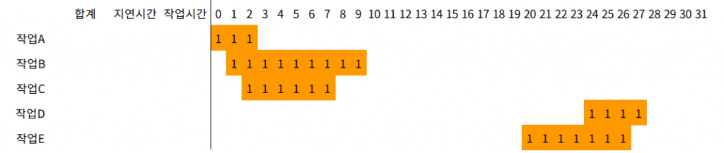 입력을 읽을 때, 24초에 들어온 작업과 20초에 들어온 작업을 결정할 수 있다. 다음과 같이 조정할 수 있다. 24초에 들어온 작업을 20초에 먼저 실행하면 작업D, 작업E를 하는데 총 11초 걸린다.