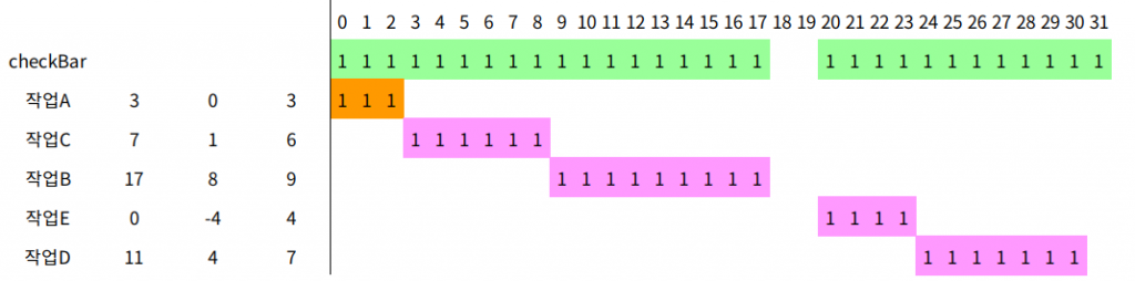 작업A부터 작업E까지 읽을 때, 필요한 작업 시간(checkBar)을 정해야 한다. 이 작업 시간안에 들어오면 작업 시간을 적은 순서대로 정렬한다. 작업 시간을 넘어가면 다음 턴에 정렬해야 한다.