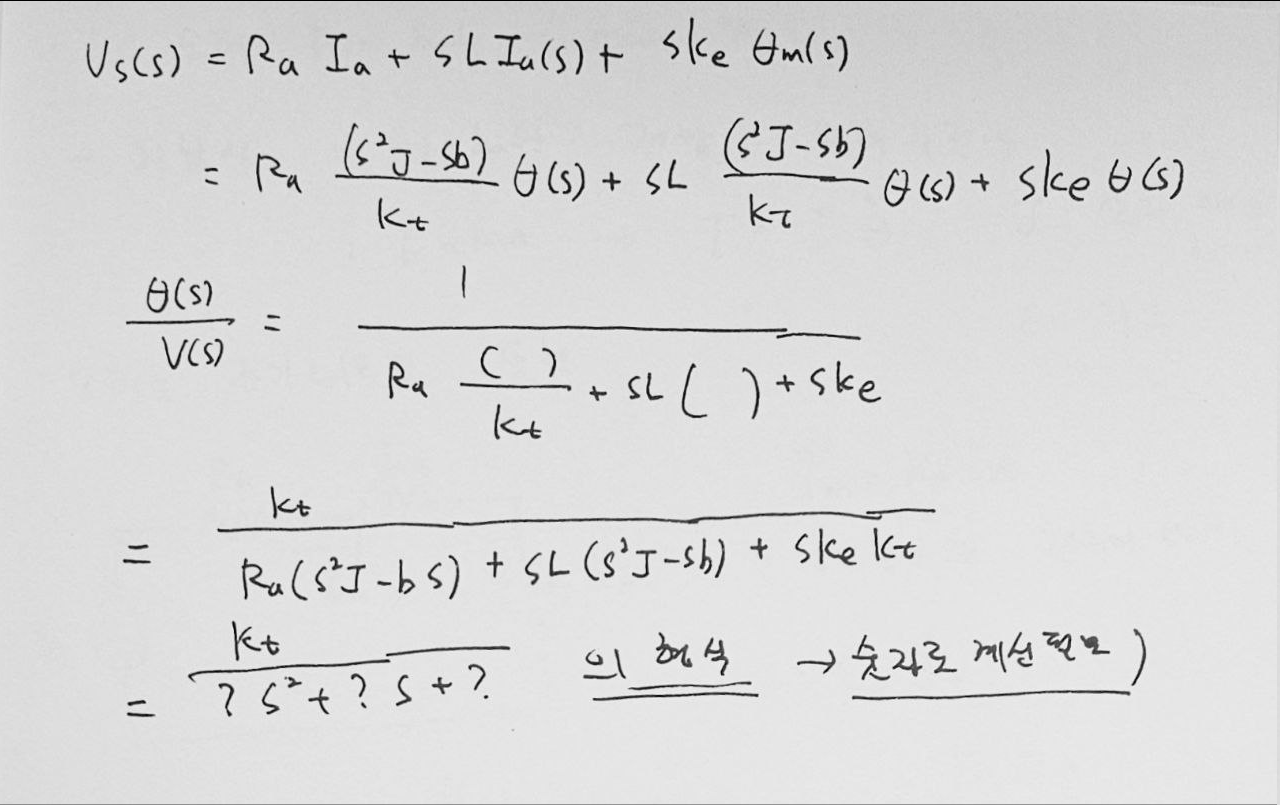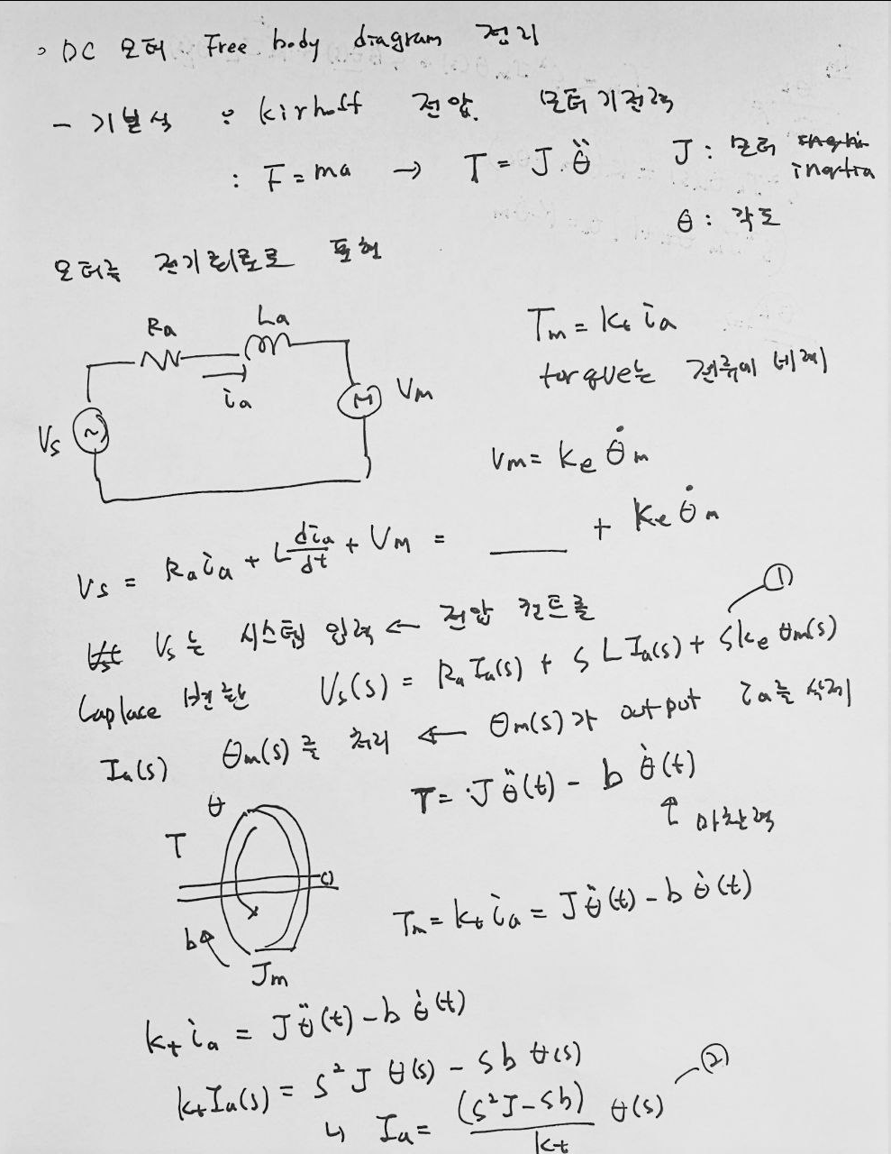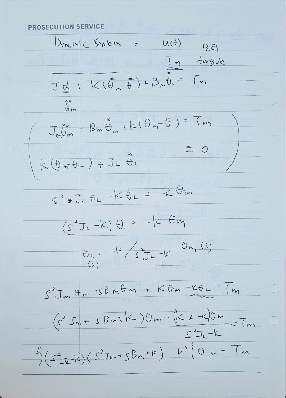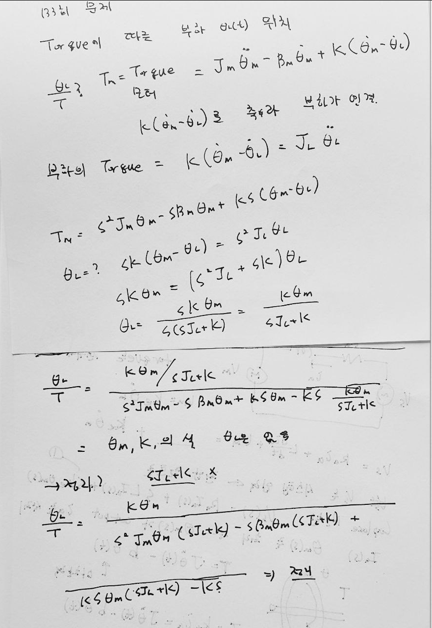 이 모델은 모터와 부하가 연결된 회전 운동 시스템입니다. 각종 파라미터를 활용하여 시스템의 동작을 표현할 수 있으며, 이를 기반으로 전달함수를 도출할 수 있습니다.
