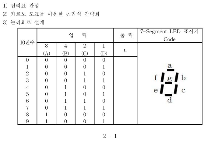 7 seg led글쓴이 이대원 / 2024-03-13 BCD 코드로 다음 7-Segment LED 표시기 Code의 표시 중 “a”만 출력으로 나오도록 변환하는 회로를 설계할 때 다음 사항을 설명하시오.