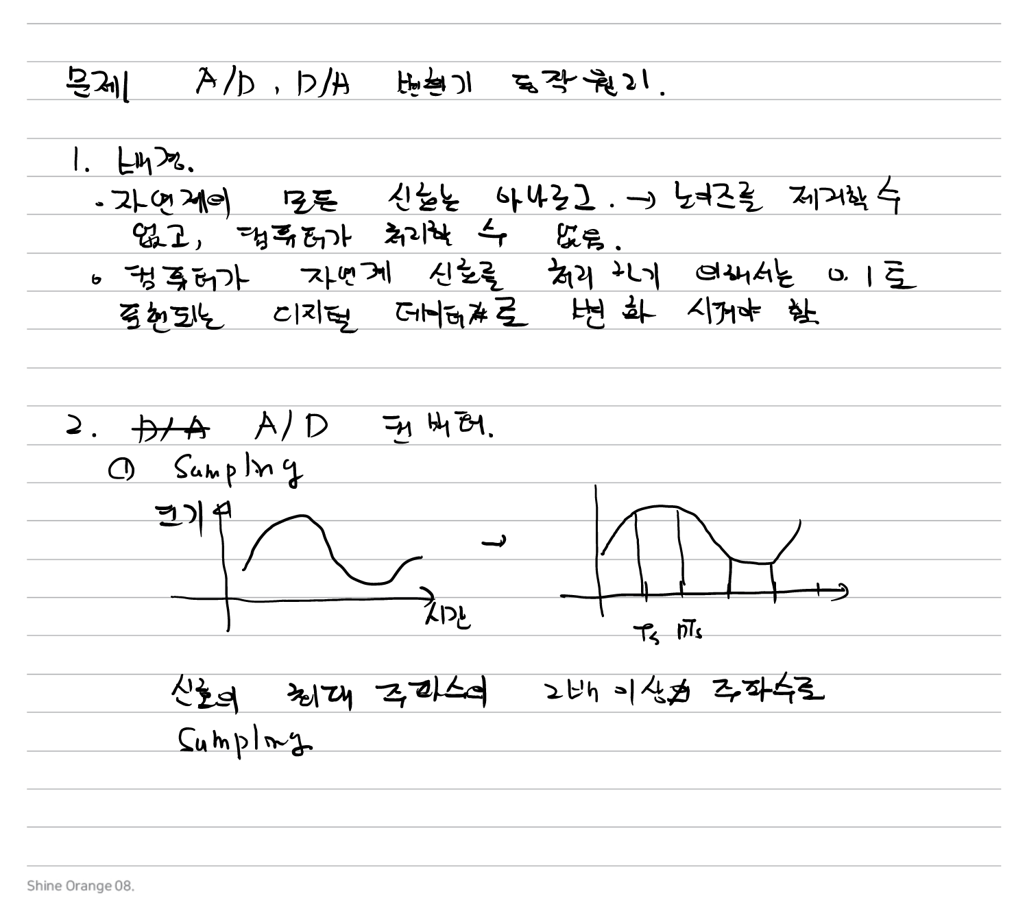 - 표본화(Sampling): 연속된 아날로그 신호의 진폭을 이산적인 주기로 추출합니다.