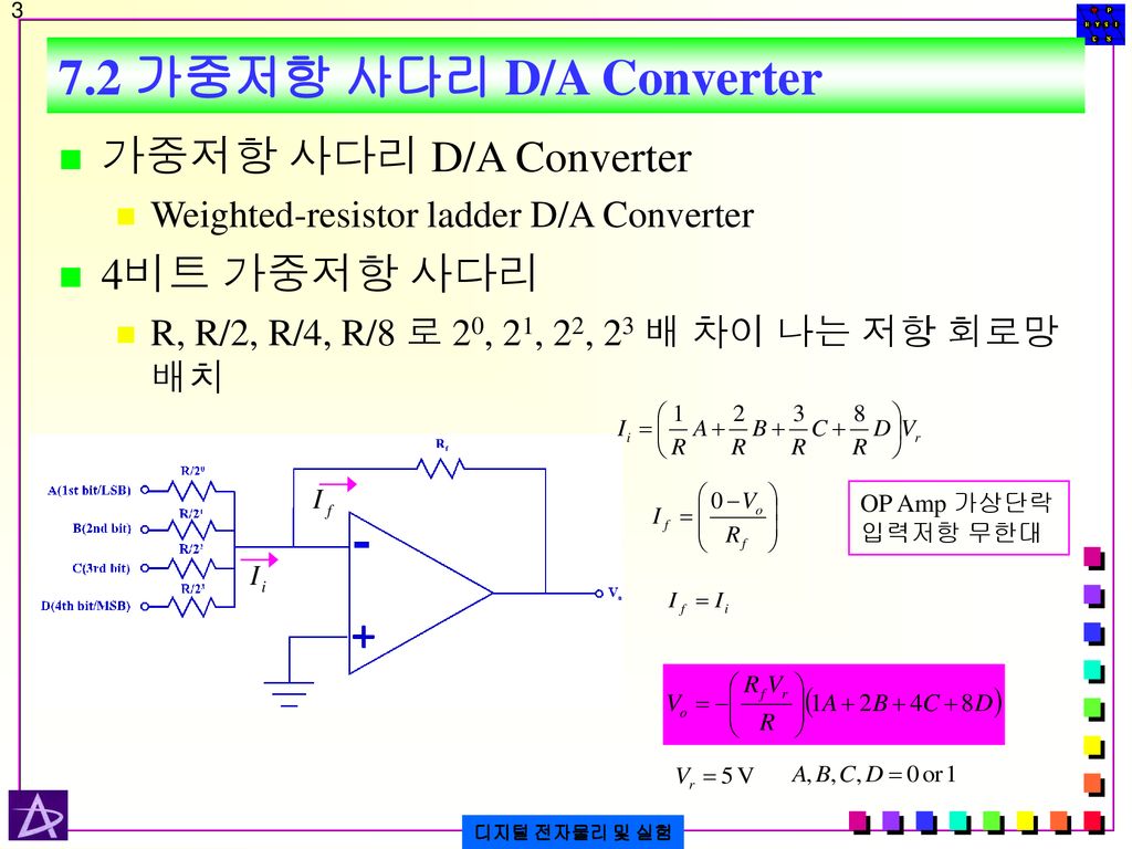 - D/A 변환기 (디지털/아날로그 변환기): D/A 변환기는 디지털 신호를 아날로그 신호로 변환하는 장치입니다. 이 변환 과정은 아래와 같은 단계를 포함합니다: