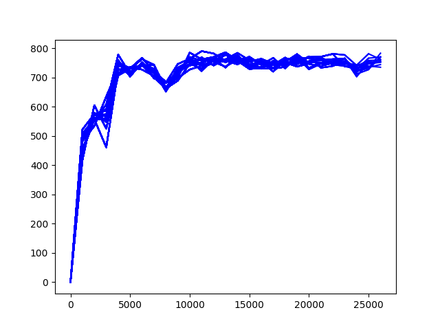 이런저런 테스트를 하다보니 코드가 넝마 조각인데, 다시 수정하긴 귀찮다. 역시 위와 같이 해도, 뒤쪽에 있는 대차를 잘 뽑아내지 못한다. 환경을 상당히 까다롭게 설정해야 한다. 중간에 return을 normailze 하여 학습하는데, normailze를 하지 말아야 할 듯하다. 각 thread 별 값이 다른데, 일정 기준으로 맞추면 각 행동을 제대로 학습시킬 수 없어 보인다. 아래 그래프가 return을 normailze로 한 경우인데, 학습이 잘 안된다. 왼쪽 숫자는 전체 1,000회 중 성공 회수다.