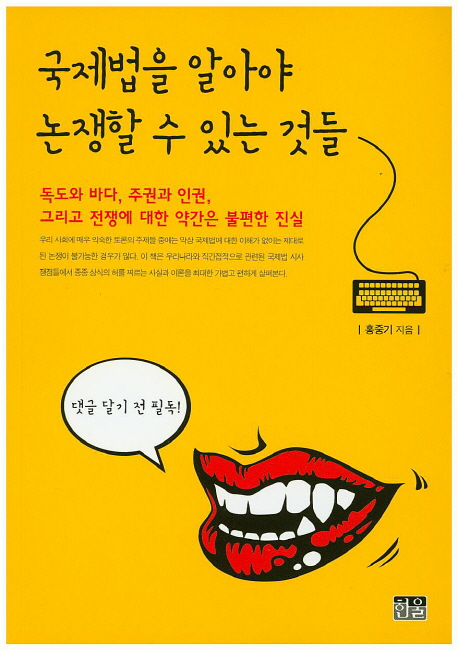 isbn:8946048875 국제법이 독도, 이어도, 주권, 인권, 전쟁을 어떻게 다루는지 설명한다. 과거 일본의 독도 도발이 한국에서 이슈가 되었다. 네티즌, 여론이 한마음으로