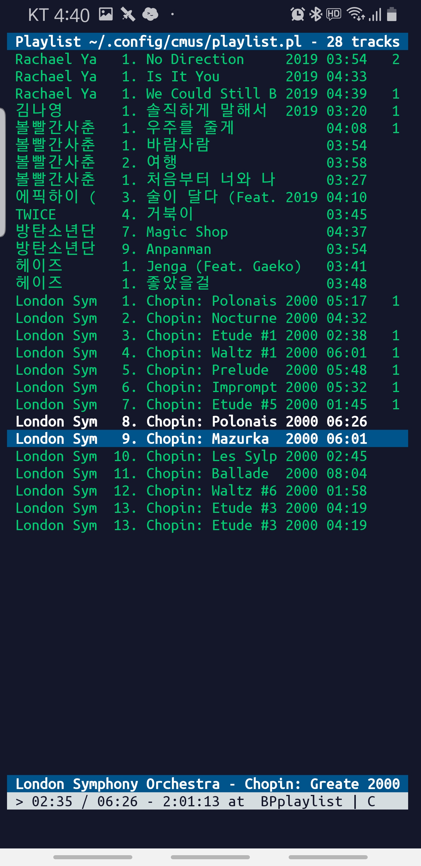콘솔에서 실행할 수 있는 음악 재생기를 찾았다. PC에 ssh로 접속하여 음악 재생기를 실행하면 PC 스피커로 출력되기 때문이다. xhost도 찾았는데 요놈은 내가 접속한 PC쪽에 출력을 내보낸다. 역시 인터넷에 능력자가 많다. 이 사람이 만든 CLI 플레이어 cmus를 활용하기로 했다. 예상대로 ssh로 접속하면 PC쪽 스피커로 출력된다.