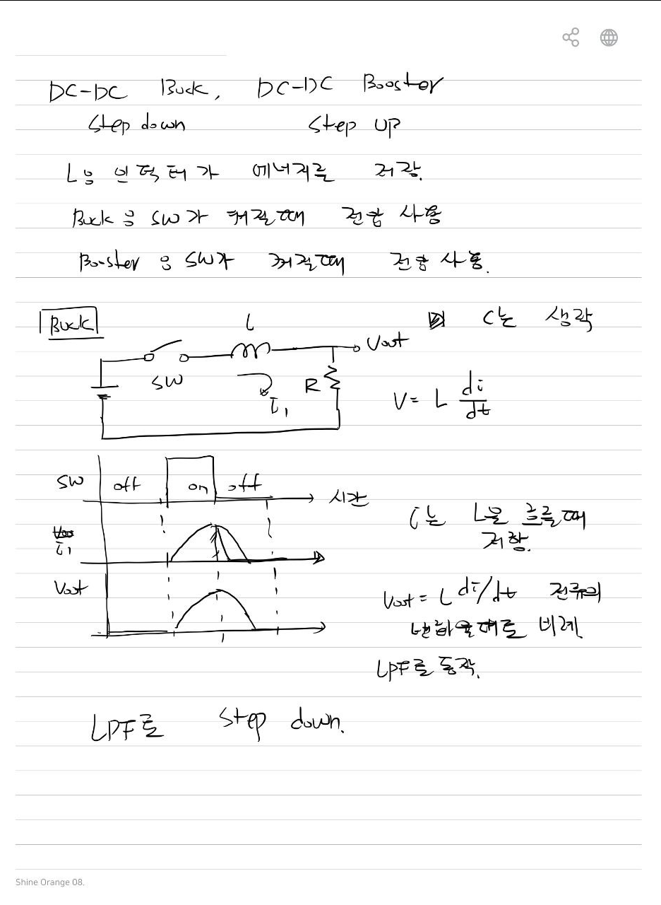 - Buck: 인덕터가 출력에 직접 연결 → 전압 낮춤