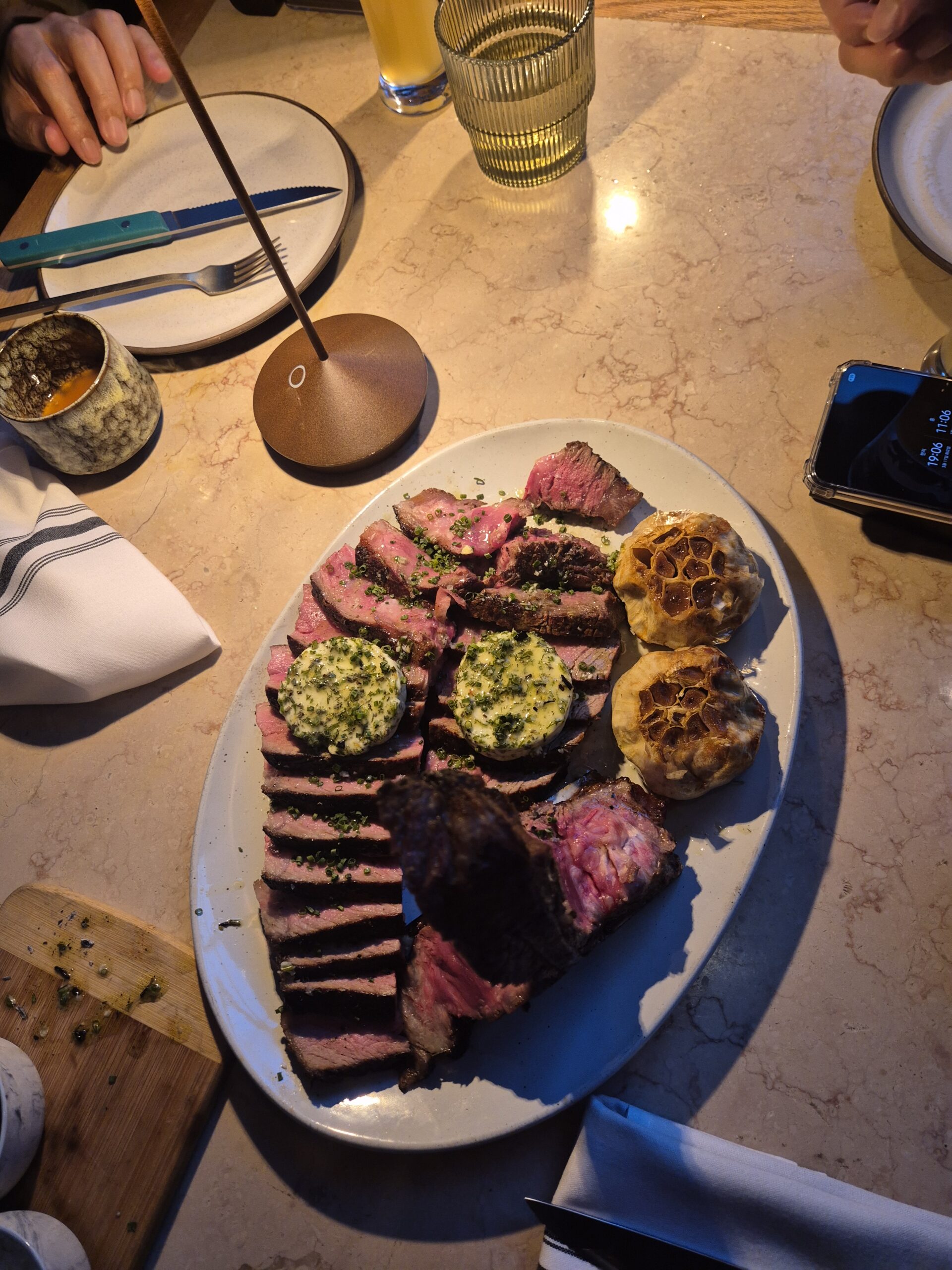 우리가 주문한 토마호크 스테이크는 시어링이 완벽하게 된 상태로, 버터와 허브 가니시가 듬뿍 올라가 있었습니다. 특히 함께 나온 구운 마늘과 부드러운 스테이크의 조화는 환상적이었습니다. 멋진 펍 분위기 속에서 시원한 맥주를 곁들이며, 오늘 하루 동안 얻은 기술적 영감과 경험을 팀원들과 나누는 즐거운 시간이었습니다.