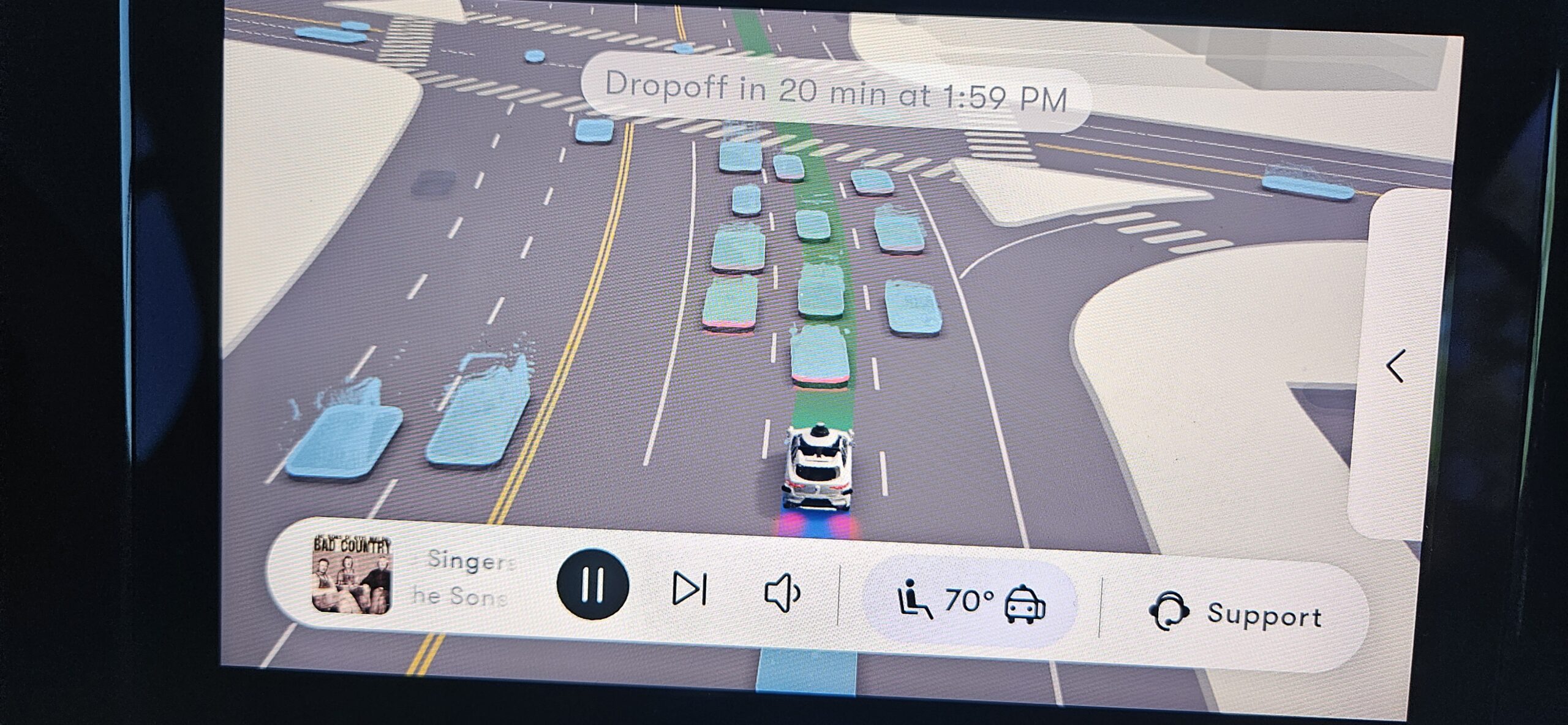 운전석에 사람이 없는 자동차에 탑승하는 것은 꽤나 긴장되는 경험이었지만, Waymo는 매우 안정적으로 주행했습니다. 차량 내부에 설치된 화면은 실시간으로 주변 도로 상황(차량, 보행자, 차선 등)을 AI가 어떻게 인식하고 있는지 보여주었습니다. “Dropoff in 20 min at 1:59 PM”이라는 안내와 함께 부드럽게 주행하는 Waymo의 기술력에 다시 한번 감탄했습니다. NVIDIA 본사에서 전시장까지의 이동 자체가 하나의 흥미로운 컨퍼런스 세션 같았습니다.