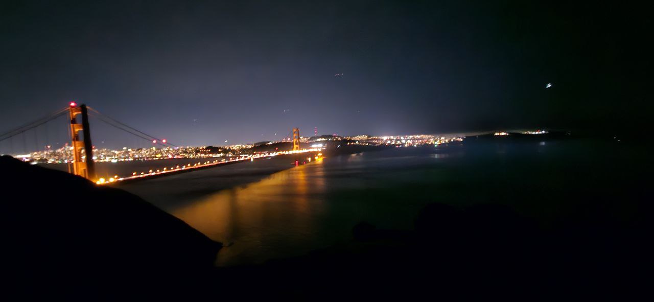 샌프란시스코의 상징, 금문교(Golden Gate Bridge)는 밤에 보니 더욱 웅장했습니다. 칠흑 같은 밤하늘과 대비되는 선명한 주황빛 교량, 그리고 그 아래로 어렴풋이 보이는 도시의 불빛들이 태평양 바다와 어우러져 장관을 이루었습니다.