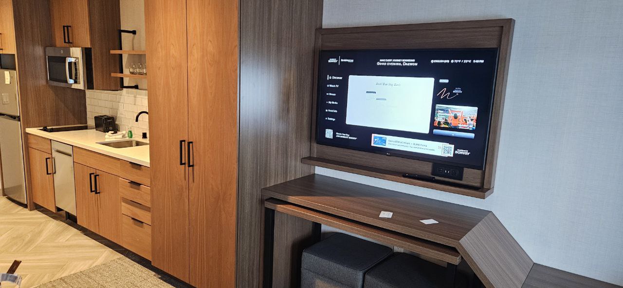 숙소 내부에는 전자레인지, 식기세척기, 토스터기까지 갖춰진 편리한 간이 주방이 딸려 있었습니다. 덕분에 현지 마트에서 장을 봐와 간단한 요리를 해 먹을 수 있었죠. 거실 한쪽에는 책상과 커다란 벽걸이 TV가 마련되어 있어, 휴식을 취하면서 다음 여행 계획을 세우기에 최적의 장소였습니다.