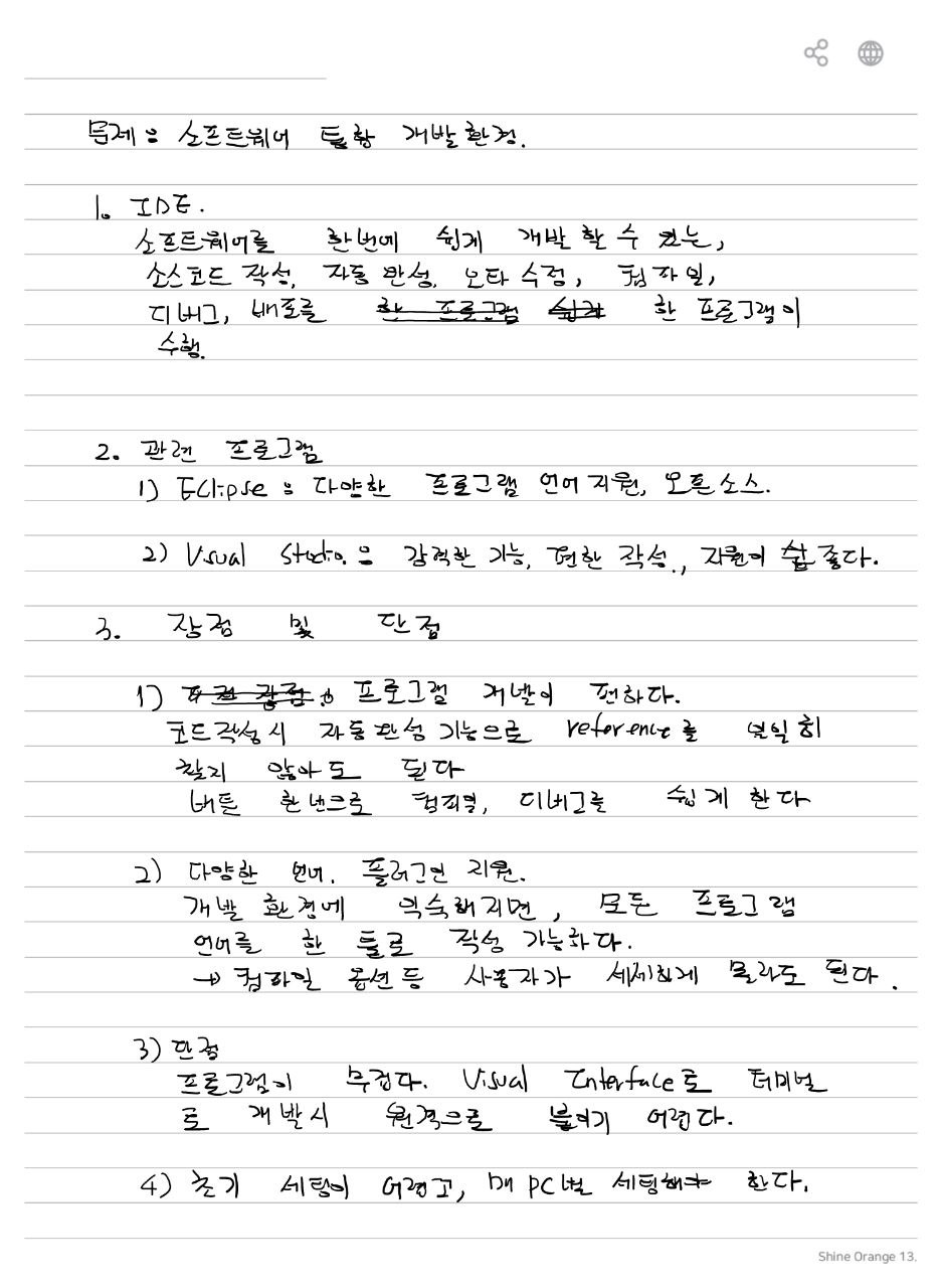 **소프트웨어 통합개발환경(Software Integrated Development Environment, IDE)**은 코딩, 디버그, 컴파일, 배포 등 프로그램 개발에 관련된 모든 작업을 하나의 프로그램 안에서 처리하는 환경을 제공하는 소프트웨어입니다1. 일반적으로 IDE는 다음과 같은 요소로 구성되어 있습니다12: