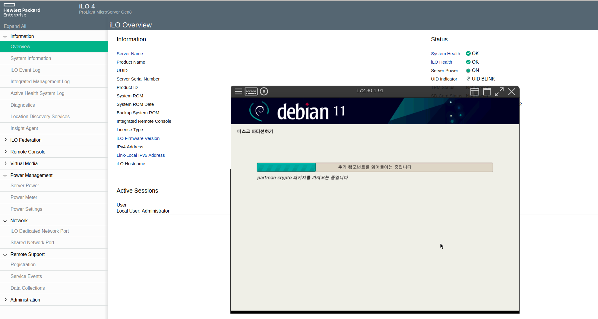 기본 버전으로는 remote console을 계속 사용할 수는 없고, 부팅 후 일정 시간이 지나면 화면만 보이고 입력을 인터넷으로 보낼 수 없다. 라인센스를 구매해야 그 이후에도 사용 가능하다. 돈 주고 라이센스를 사려다가 무선 키보드, 마우스를 서버에 직접 연결하여 사용했다. 화면은 일정 시간동안 보이니까 OS를 설치하는데 문제 없다.