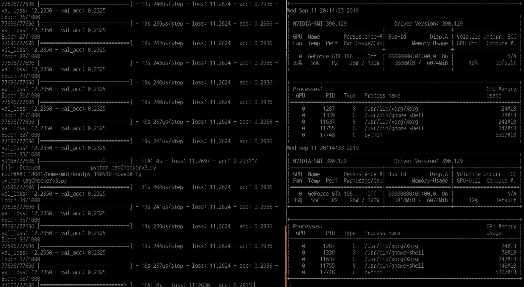 root@AMD-1804:/home/mnt/konlpy_190910_moved# python tagCheckerv3.py /usr/local/lib/python3.5/dist-packages/jpype/_core.py:210: UserWarning: ------------------------------------------------------------------------------- Deprecated: convertStrings was not specified when starting the JVM. The default behavior in JPype will be False starting in JPype 0.8. The recommended setting for new code is convertStrings=False. The legacy value of True was assumed for this session. If you are a user of an application that reported this warning, please file a ticket with the developer. ------------------------------------------------------------------------------- """) Using TensorFlow backend. Word2Vec(vocab=3532, size=4, alpha=0.025) 2019-09-11 11:02:33.941682: I tensorflow/core/common_runtime/gpu/gpu_device.cc:1432] Found device 0 with properties: name: GeForce GTX 1060 6GB major: 6 minor: 1 memoryClockRate(GHz): 1.7085 pciBusID: 0000:01:00.0 totalMemory: 5.93GiB freeMemory: 5.38GiB 2019-09-11 11:02:33.941740: I tensorflow/core/common_runtime/gpu/gpu_device.cc:1511] Adding visible gpu devices: 0 2019-09-11 11:02:34.356140: I tensorflow/core/common_runtime/gpu/gpu_device.cc:982] Device interconnect StreamExecutor with strength 1 edge matrix: 2019-09-11 11:02:34.356206: I tensorflow/core/common_runtime/gpu/gpu_device.cc:988] 0 2019-09-11 11:02:34.356217: I tensorflow/core/common_runtime/gpu/gpu_device.cc:1001] 0: N 2019-09-11 11:02:34.356473: I tensorflow/core/common_runtime/gpu/gpu_device.cc:1115] Created TensorFlow device (/job:localhost/replica:0/task:0/device:GPU:0 with 5138 MB memory) -> physical GPU (device: 0, name: GeForce GTX 1060 6GB, pci bus id: 0000:01:00.0, compute capability: 6.1) Train on 77696 samples, validate on 19424 samples Epoch 1/1000 77696/77696 [==============================] - 19s 248us/step - loss: 11.2624 - acc: 0.2936 - val_loss: 12.2350 - val_acc: 0.2325 Epoch 2/1000 77696/77696 [==============================] - 18s 238us/step - loss: 11.2624 - acc: 0.2936 - val_loss: 12.2350 - val_acc: 0.2325 Epoch 3/1000 77696/77696 [==============================] - 19s 240us/step - loss: 11.2624 - acc: 0.2936 - val_loss: 12.2350 - val_acc: 0.2325 Epoch 4/1000 77696/77696 [==============================] - 19s 239us/step - loss: 11.2624 - acc: 0.2936 - val_loss: 12.2350 - val_acc: 0.2325 Epoch 5/1000 77696/77696 [==============================] - 19s 241us/step - loss: 11.2624 - acc: 0.2936 - val_loss: 12.2350 - val_acc: 0.2325 Epoch 6/1000 77696/77696 [==============================] - 19s 240us/step - loss: 11.2624 - acc: 0.2936 - val_loss: 12.2350 - val_acc: 0.2325 Epoch 7/1000 77696/77696 [==============================] - 18s 238us/step - loss: 11.2624 - acc: 0.2936 - val_loss: 12.2350 - val_acc: 0.2325 Epoch 8/1000 77696/77696 [==============================] - 19s 241us/step - loss: 11.2624 - acc: 0.2936 - val_loss: 12.2350 - val_acc: 0.2325 Epoch 9/1000 77696/77696 [==============================] - 19s 243us/step - loss: 11.2624 - acc: 0.2936 - val_loss: 12.2350 - val_acc: 0.2325 Epoch 10/1000 77696/77696 [==============================] - 19s 241us/step - loss: 11.2624 - acc: 0.2936 - val_loss: 12.2350 - val_acc: 0.2325 Epoch 11/1000 77696/77696 [==============================] - 19s 240us/step - loss: 11.2624 - acc: 0.2936 - val_loss: 12.2350 - val_acc: 0.2325 Epoch 12/1000 77696/77696 [==============================] - 18s 238us/step - loss: 11.2624 - acc: 0.2936 - val_loss: 12.2350 - val_acc: 0.2325 Epoch 13/1000 77696/77696 [==============================] - 18s 238us/step - loss: 11.2624 - acc: 0.2936 - val_loss: 12.2350 - val_acc: 0.2325 Epoch 14/1000 77696/77696 [==============================] - 19s 241us/step - loss: 11.2624 - acc: 0.2936 - val_loss: 12.2350 - val_acc: 0.2325 Epoch 15/1000 77696/77696 [==============================] - 19s 241us/step - loss: 11.2624 - acc: 0.2936 - val_loss: 12.2350 - val_acc: 0.2325 Epoch 16/1000 77696/77696 [==============================] - 19s 242us/step - loss: 11.2624 - acc: 0.2936 - val_loss: 12.2350 - val_acc: 0.2325 Epoch 17/1000 77696/77696 [==============================] - 19s 242us/step - loss: 11.2624 - acc: 0.2936 - val_loss: 12.2350 - val_acc: 0.2325 Epoch 18/1000 77696/77696 [==============================] - 19s 240us/step - loss: 11.2624 - acc: 0.2936 - val_loss: 12.2350 - val_acc: 0.2325 Epoch 19/1000 77696/77696 [==============================] - 19s 241us/step - loss: 11.2624 - acc: 0.2936 - val_loss: 12.2350 - val_acc: 0.2325 Epoch 20/1000 77696/77696 [==============================] - 19s 240us/step - loss: 11.2624 - acc: 0.2936 - val_loss: 12.2350 - val_acc: 0.2325 Epoch 21/1000 77696/77696 [==============================] - 19s 241us/step - loss: 11.2624 - acc: 0.2936 - val_loss: 12.2350 - val_acc: 0.2325 Epoch 22/1000 77696/77696 [==============================] - 19s 242us/step - loss: 11.2624 - acc: 0.2936 - val_loss: 12.2350 - val_acc: 0.2325 Epoch 23/1000 77696/77696 [==============================] - 19s 240us/step - loss: 11.2624 - acc: 0.2936 - val_loss: 12.2350 - val_acc: 0.2325 Epoch 24/1000 77696/77696 [==============================] - 19s 240us/step - loss: 11.2624 - acc: 0.2936 - val_loss: 12.2350 - val_acc: 0.2325 Epoch 25/1000 77696/77696 [==============================] - 19s 240us/step - loss: 11.2624 - acc: 0.2936 - val_loss: 12.2350 - val_acc: 0.2325 Epoch 26/1000 77696/77696 [==============================] - 19s 239us/step - loss: 11.2624 - acc: 0.2936 - val_loss: 12.2350 - val_acc: 0.2325 Epoch 27/1000 77696/77696 [==============================] - 19s 242us/step - loss: 11.2624 - acc: 0.2936 - val_loss: 12.2350 - val_acc: 0.2325 Epoch 28/1000 77696/77696 [==============================] - 19s 243us/step - loss: 11.2624 - acc: 0.2936 - val_loss: 12.2350 - val_acc: 0.2325 Epoch 29/1000 77696/77696 [==============================] - 19s 240us/step - loss: 11.2624 - acc: 0.2936 - val_loss: 12.2350 - val_acc: 0.2325 Epoch 30/1000 77696/77696 [==============================] - 19s 240us/ste