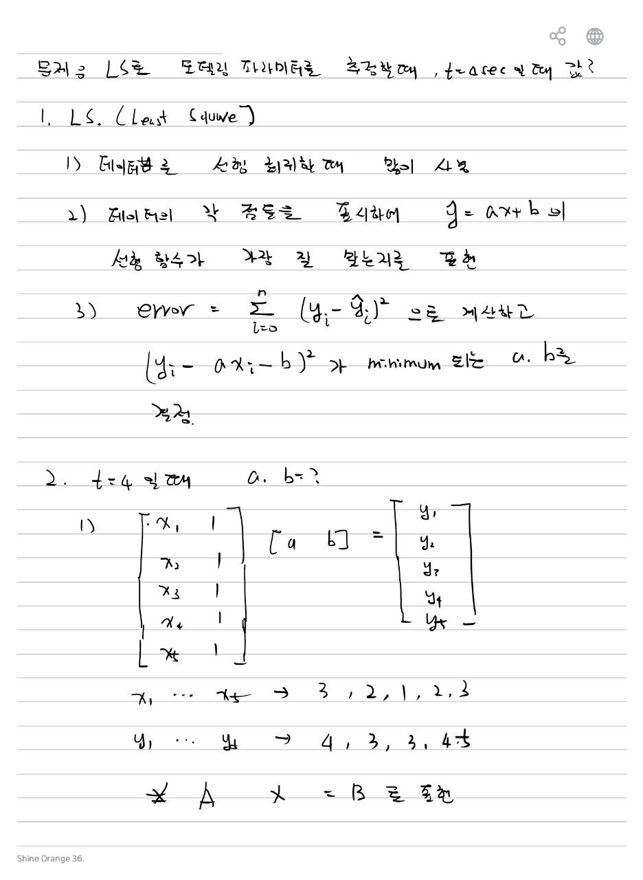 Least Square글쓴이 이대원 / 2024-03-10 다음과 같이 이산(Discrete)시스템에 대한 모델링 파라메터를 추정하고자 한다. LS(Least Square: 추정치 오차 자승 합)방식을 이용할 때 t=4sec 순간의 a값의 추정치를 구하시오. least-square다운로드 https://darkpgmr.tistory.com/56