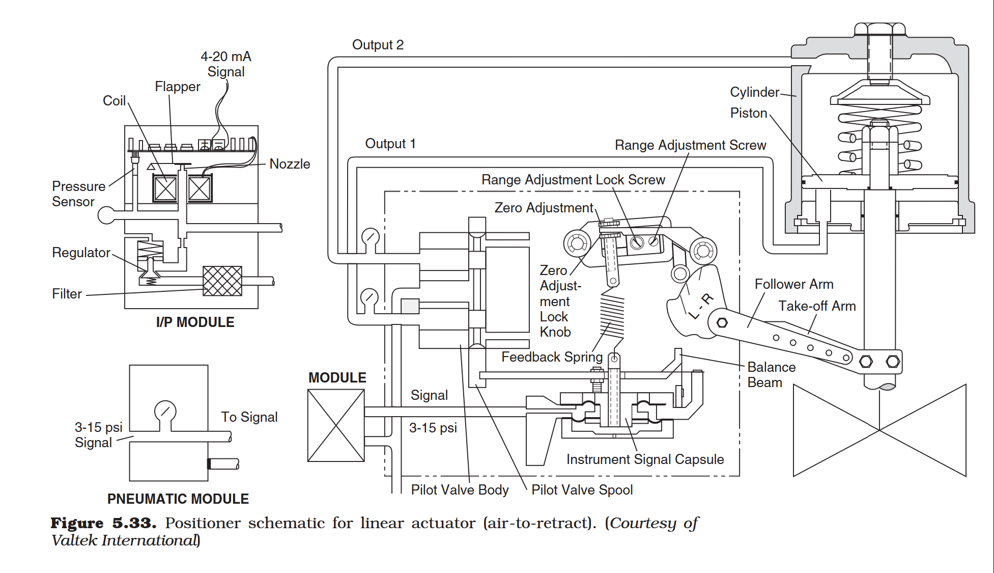 공압 신호(3-15 psi)는 다이어프램을 움직이는 힘을 제공하며, 이를 통해 밸브 및 액추에이터의 위치를 조정하고 정확하게 제어하는 데 사용됩니다. 이 시스템은 피드백 루프를 포함하여 신호와 출력 간의 오차를 줄이는 방식으로 작동합니다.
