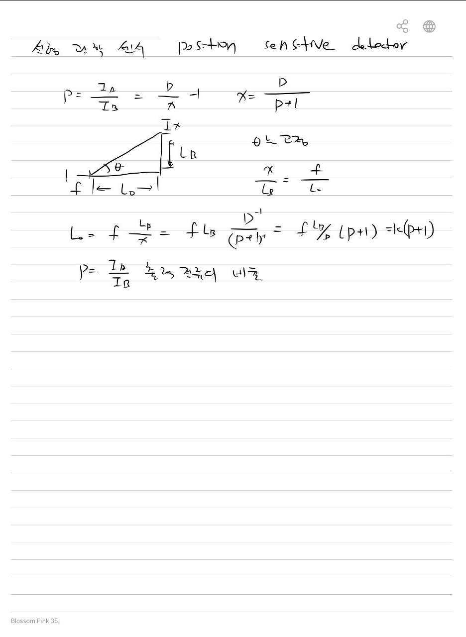 즉, P는 센서 위에 떨어진 빛의 위치에 따라 두 전극으로 흐르는 전류의 분포가 어떻게 변화하는지를 수치로 표현한 것으로, 이를 이용하여 빛의 정확한 입사 지점 ( x )를 계산할 수 있습니다. 예를 들어, ( P )의 값이 클수록 빛이 한쪽 끝에 더 가까이 떨어졌음을 나타내며, 반대로 ( P )가 작으면 다른 쪽 끝에 가깝다는 것을 의미합니다.