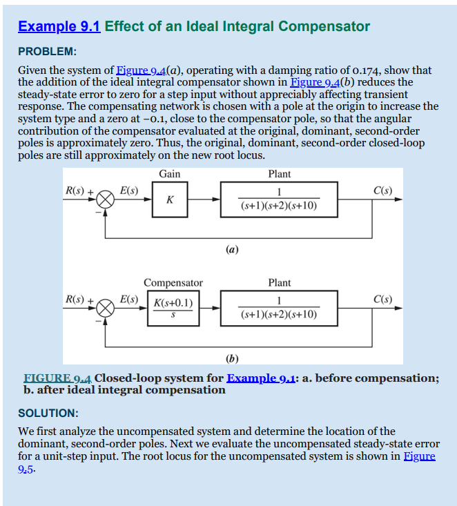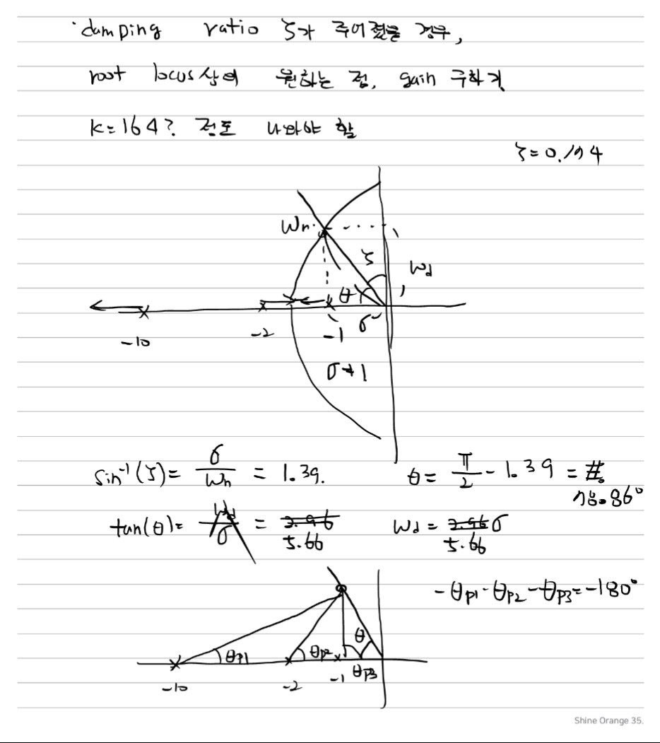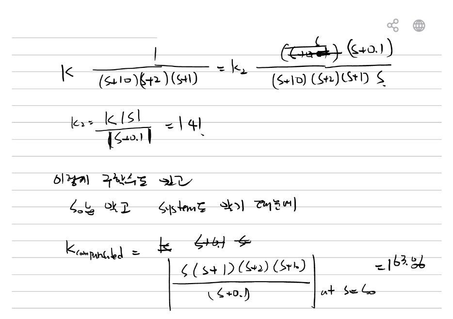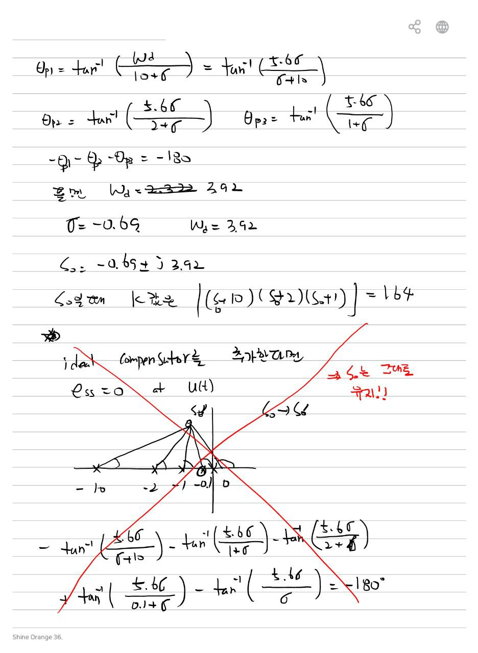 lag compensator 설계 root locus design글쓴이 이대원 / 2024-01-28 Root Locus로 damping ration가 정해졌을 경우, 목표점을 구하기 Control Systems Engineering 예제 https://electronics.stackexchange.com/questions/333310/how-to-find-the-intersection-point-in-rootlocus-diagram