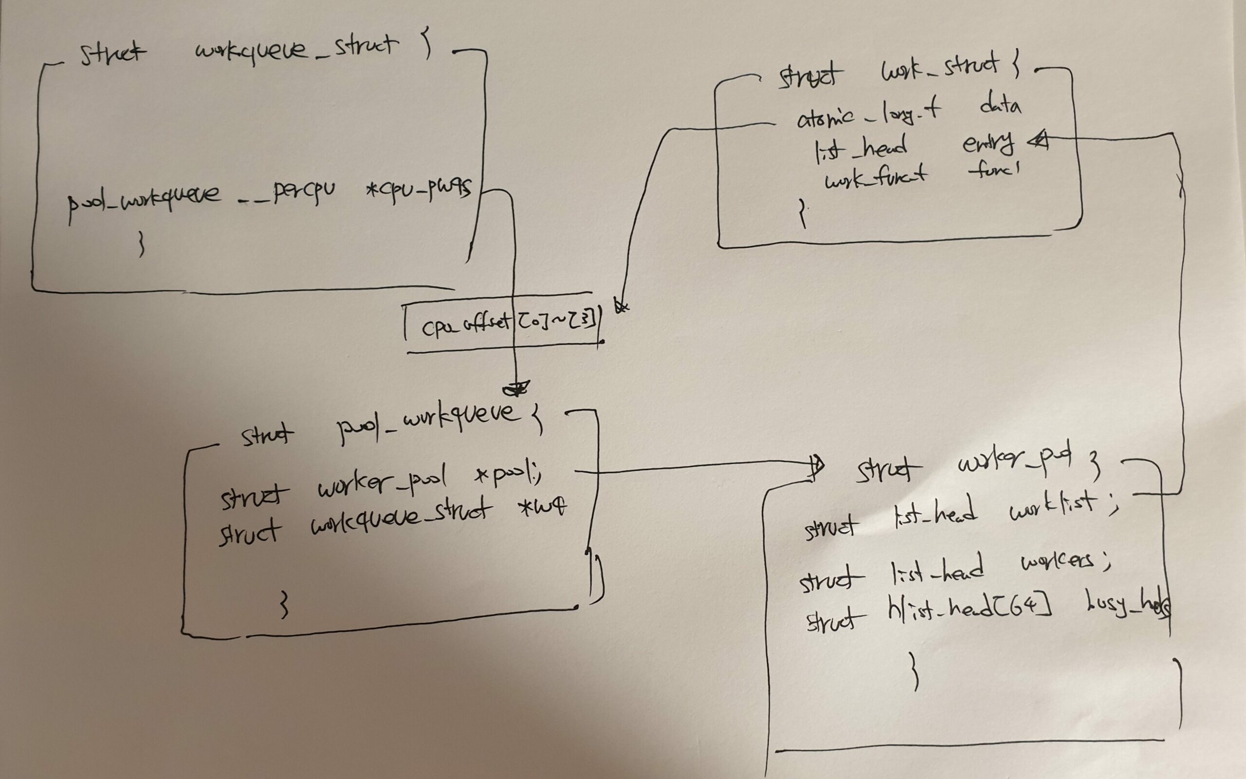 리눅스가 work queue를 다양하게 사용한다. 나는 초짜라 DECLARE_WORK와 INIT_WORK를 구분할 수 없었다. DECLARE_WORK가 work struct를 전역 변수로 선언한다. 여러 work로 같은 데이터에 접근할 수 있다. workqueue funtion() 파라미터로 work struct를 넣는데, 여기로 work를 전달하면 된다. 코드가 넝마조각이 되고 있다.